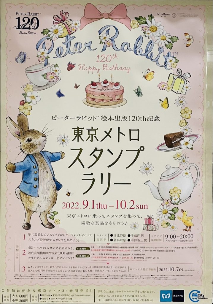 今日はたまちゃんの習い事で電車で向かったのですが、地下鉄のポスターでこんなものを発見! ピーターラビット120周年記念イベントスタンプラリー!期間:2022年9月2日(木)〜2022年10月2日(日)場所:日比谷・半蔵門・茅場町・中野坂上駅内容:先着5000名に...